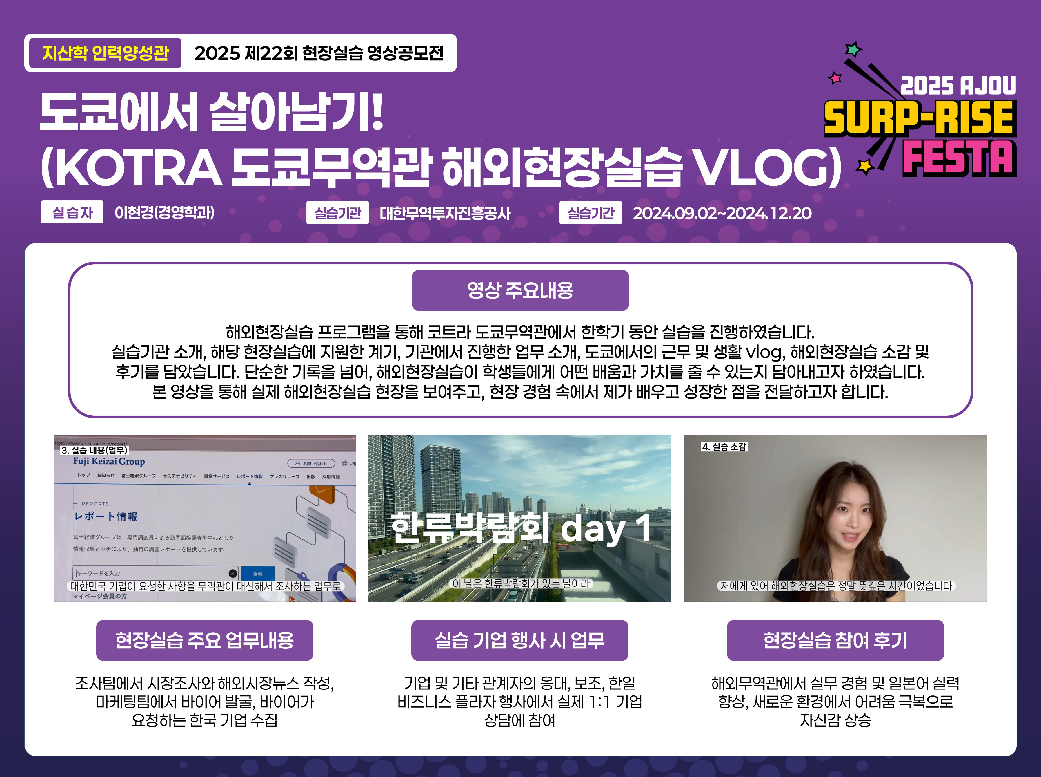 HOME ACOT 전시관 [현장실습] 2025 제 22회 현장실습 수기·영상공모전 [현장실습] 2025 제 22회 현장실습 수기·영상공모전 [영상] 도쿄에서 살아남기!(KOTRA 도쿄무역관 해외현장실습 VLOG) 좋아요좋아요 51개 목록 김선희 와, 짧은 영상에 스토리가 알차게 들어가서 소개영상으로 훌륭합니다. 우리 학교에 능력자가 많군요! 2025.12.11 김예지 코트라 무역관 현장실습에서 어떤 일을 하는지 자세하게 알 수 있어서 너무 좋네요!! 저도 도전해보고 싶어요~ 2025.12.11 한예원 정말 유익한 정보입니다! 나중에 현장실습을 하게 된다면 참고하기 딱 좋은 자료예요!! 2025.12.11